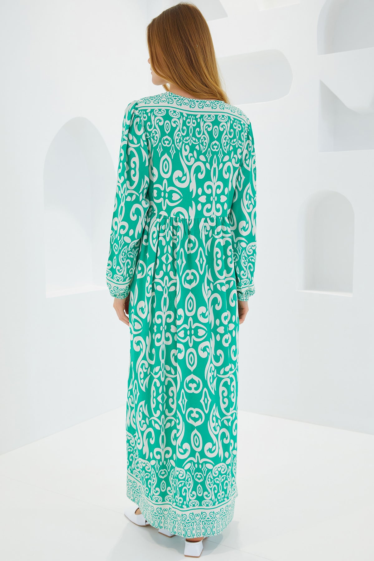 Bigdart Mönstrad Lång Viskos Klänning - Grön & Ecru
