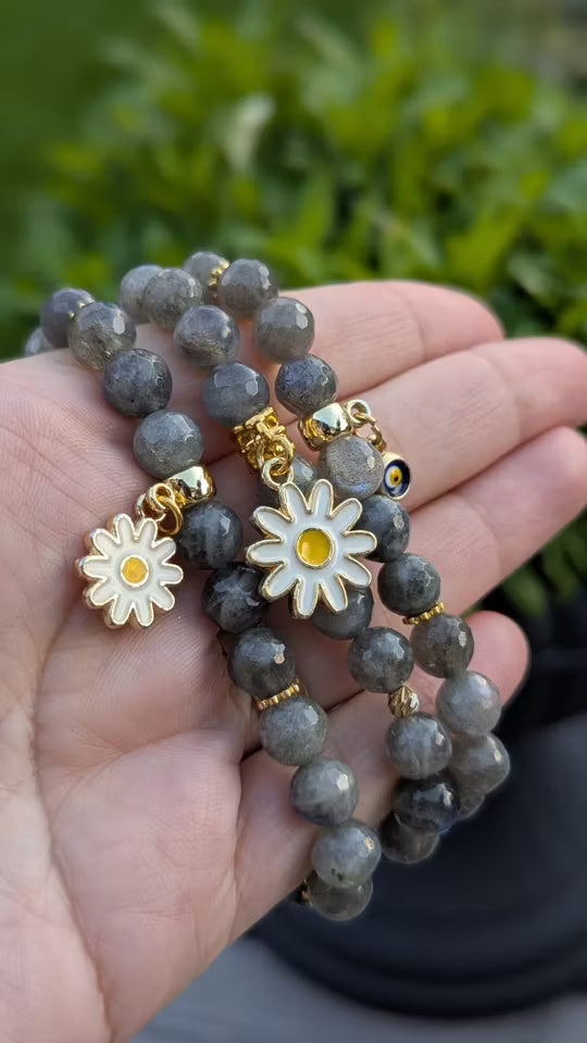 Grå labradorit stens armband med prästkragefigur (8mm)