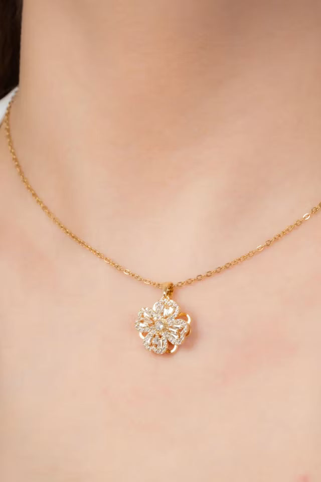 Detta guldpläterade stenhalsband med blommotiv med en elegant och stilren design ger dina kombinationer en bländande gnistra. Dess stenprydda design, prydd med blomdetaljer, ger en modern och elegant touch till halsbandet. Tillverkat av rostfritt stål, detta halsband är slitstarkt, mattas inte och orsakar inte allergier. Det är det perfekta tillbehöret för att komplettera din stil vid speciella tillfällen och för dagligt bruk.