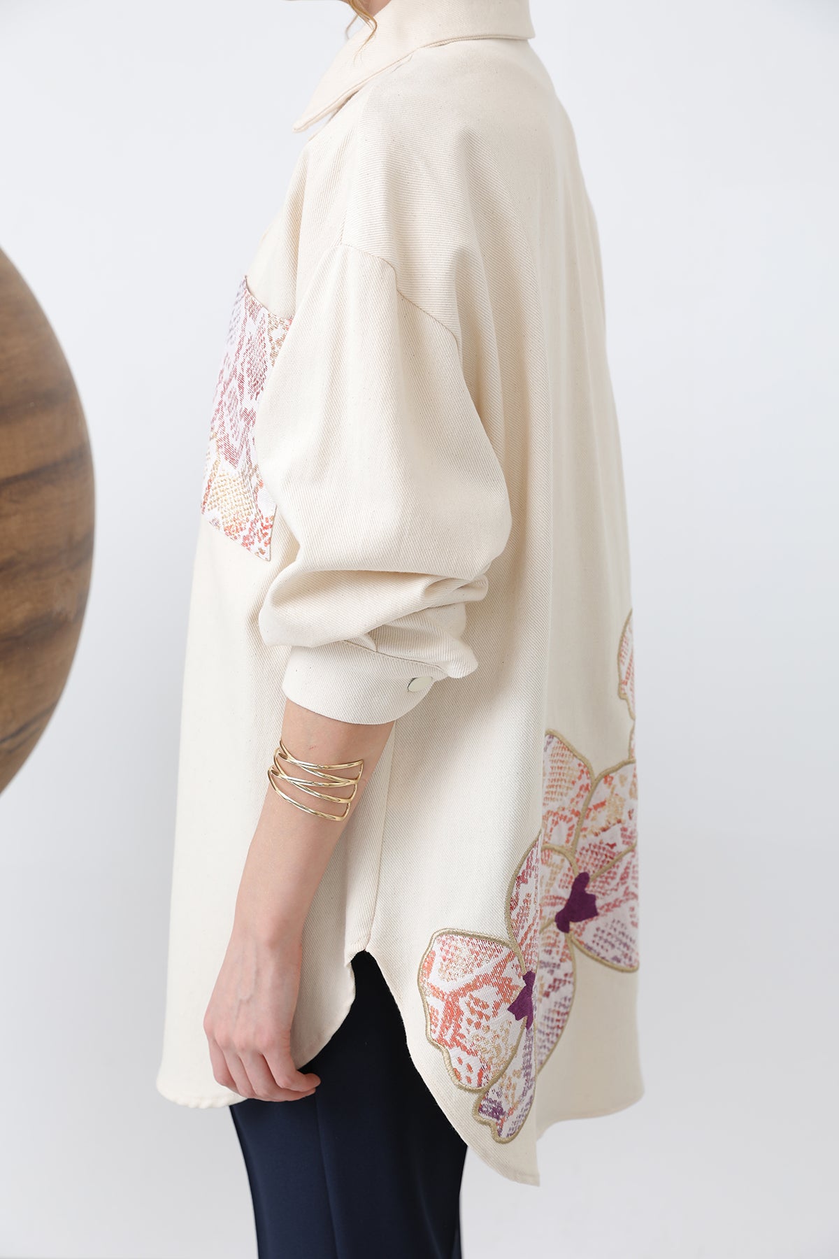 Denna tunika utmärker sig med sin dekorativa framficka samt eleganta broderier på ryggen som ger plagget ett sofistikerat uttryck. Tillverkad i ett naturligt bomulls- och linnetyg erbjuder den hög komfort, god andningsförmåga och en lätt struktur som passar utmärkt för dagligt bruk.