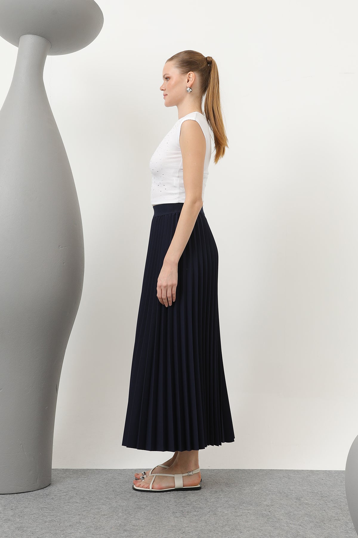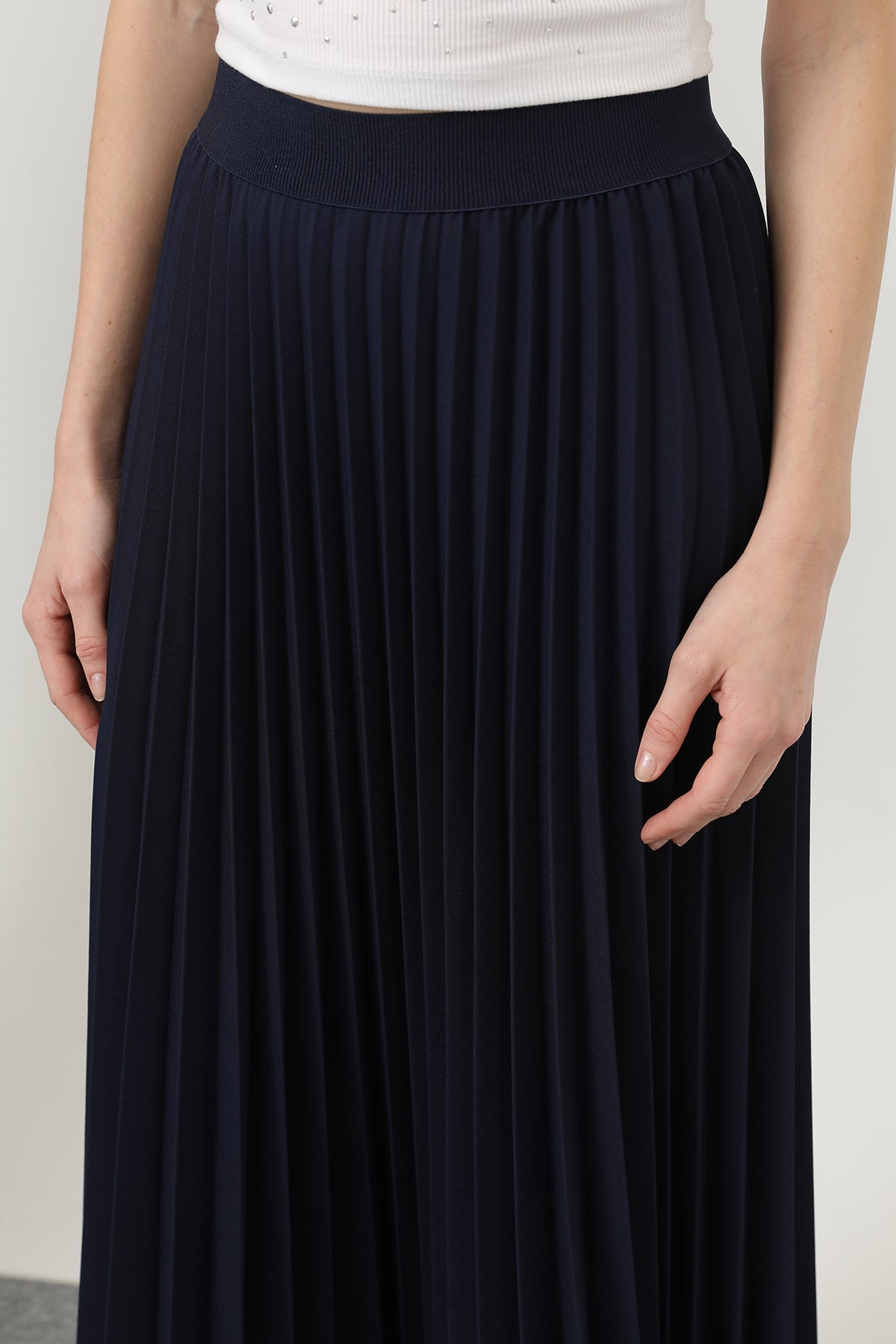 Beskrivning: Symbolen för elegans, den veckade kjolen erbjuder elegans i varje steg med sin flytande textur. Medan den försiktigt kramar kroppens linjer tack vare sin höga midja, lägger den till en romantisk atmosfär till dina kombinationer med sin mobila struktur. Ett perfekt val för att fullborda din elegans vid dagliga och speciella tillfällen!